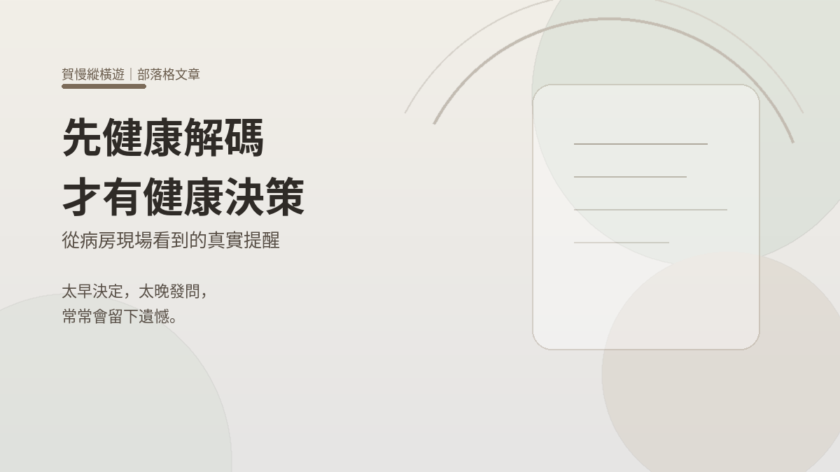 最近因為一位好朋友罹患癌症,我實際走進病房,也陪著他一起經歷從發現問題、找醫生、比較意見,到確認手術方向的過程。甚至有一次,我還親手幫他清潔人工造口。這段真實現場的經驗,讓我更深刻理解到:有健康概念,不代表不會生病;有養生習慣,也不代表不會出狀況。當人真正走到治病與救命階段,最重要的不是盲從單一權威,而是先把事情看懂,完成健康解碼,再進入健康決策。